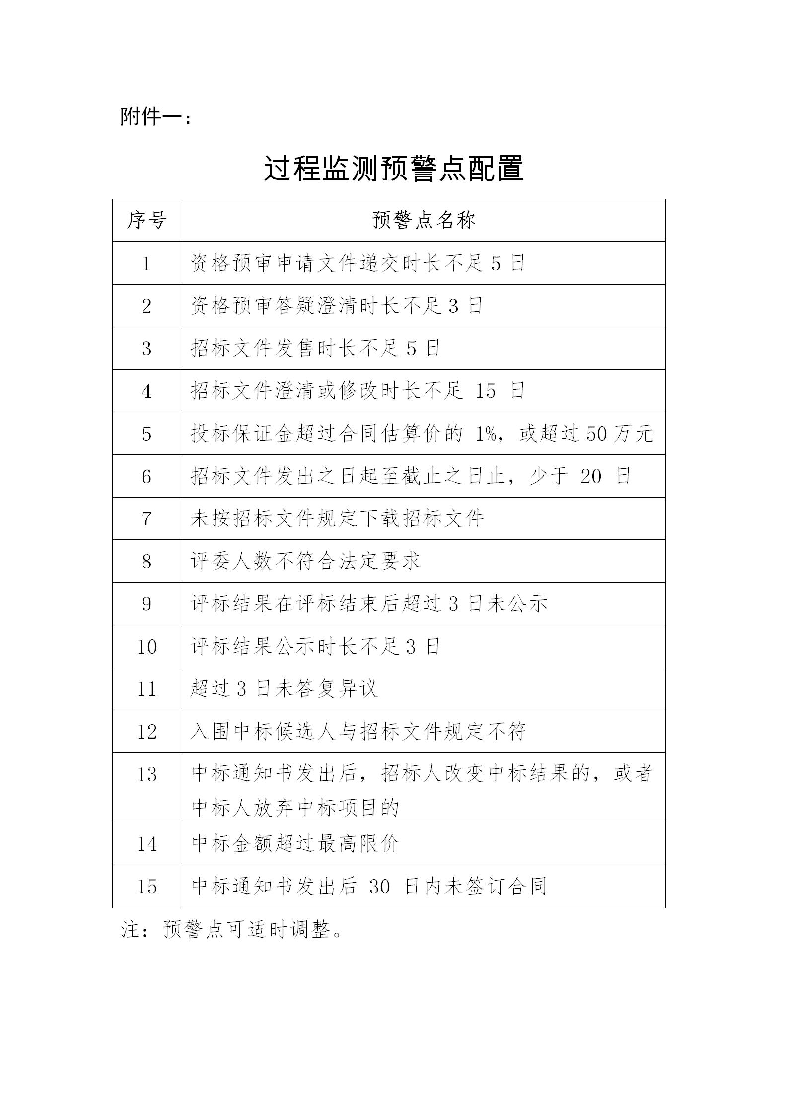 第四条 按照工程建设项目招标投标相关法律、法规、规章的规定和要求,过程监管系统设置了15个监测预警点(预警点可适时调整,具体见附件一)对交易过程进行实时监测预警。