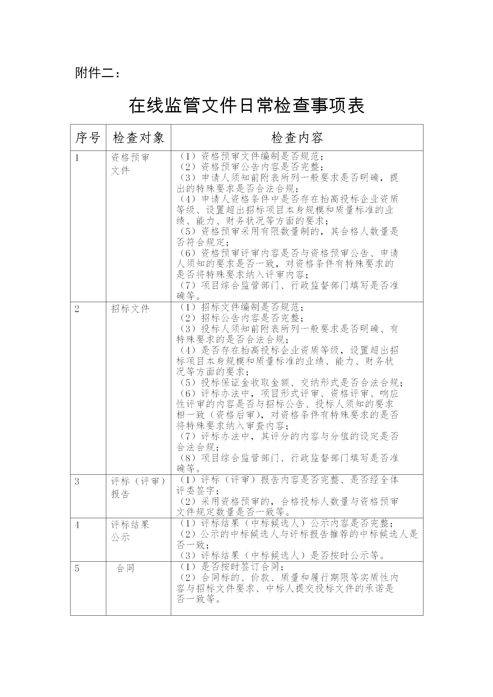 (二)文件日常检查。对资格预审文件、招标文件、评标(评审)报告、评标结果公示、合同等文件的合法合规性进行随机抽查,发现问题立即处理。