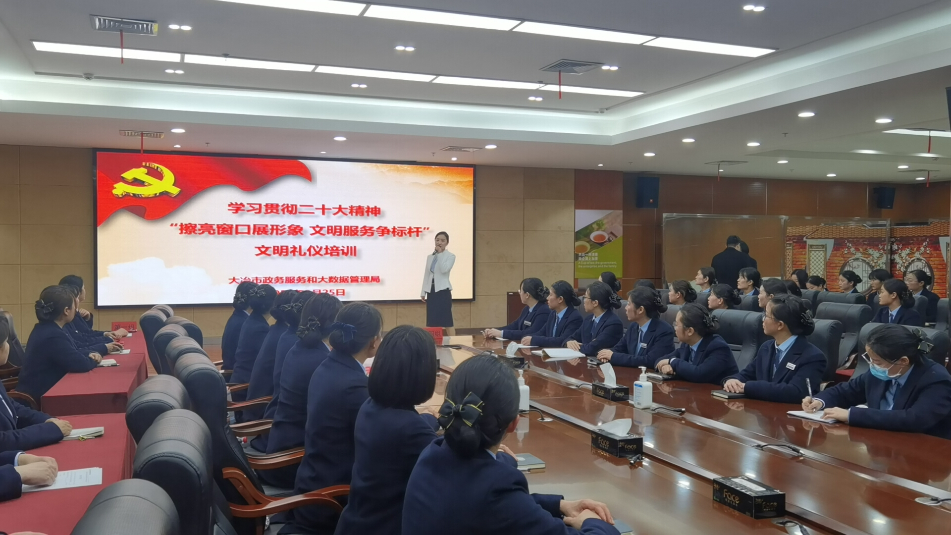 文明礼仪,是一种内在的精神底蕴,是一个人素质与修养的体现,也代表了政务中心的形象。为进一步加强党的建设,增强全体党员干部的凝聚力、战斗力,持续强化为民服务的理念,切实提升政务服务窗口工作人员职业素养和服务水平,激发政务服务新活力,牢固树立政务服务“暖如春风”新形象。2月25日上午,大冶市政务服务和大数据管理局组织深圳市特发政务服务有限公司大冶项目全体综窗人员,开展以“擦亮窗口展形象,文明服务争标杆”为主题的政务服务礼仪专题培训。