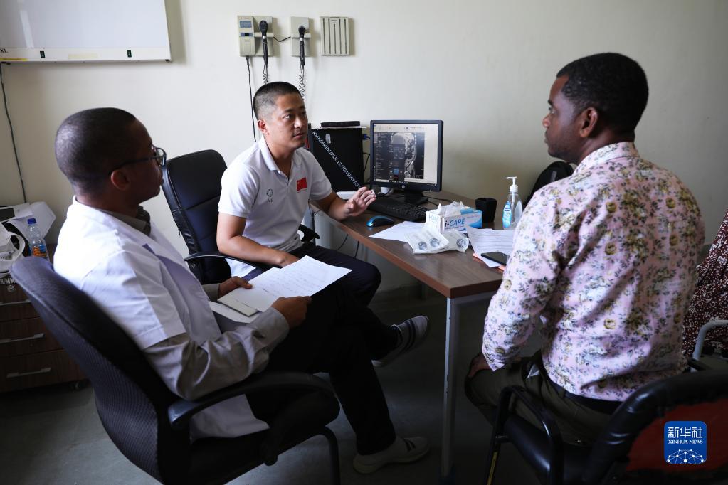 2023年2月22日,在坦桑尼亚桑给巴尔岛纳兹莫加医院,中国援桑给巴尔医疗队成员郭伟(左二)给病人看病。新华社记者 董江辉 摄