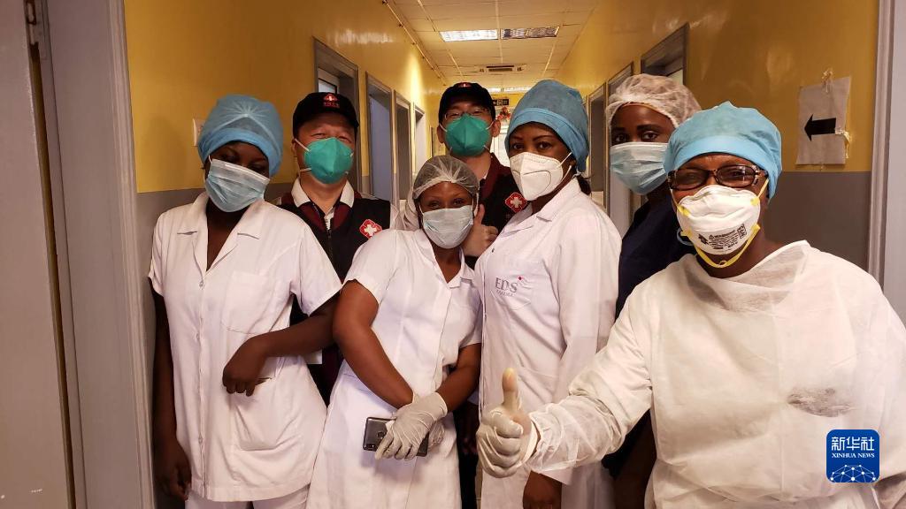 2020年5月26日,中国抗疫医疗专家组在刚果(布)首都布拉柴维尔指导新冠肺炎病房建设时,与当地一线医务人员合影。新华社发