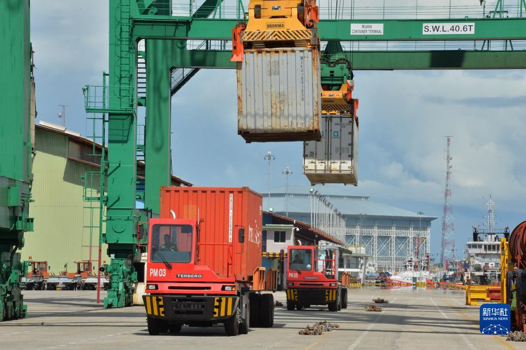 这是2022年1月1日拍摄的正在进行集装箱装卸作业的文莱摩拉港码头。文莱摩拉港由中国和文莱合资企业——摩拉港有限公司运营。2022年1月1日,区域全面经济伙伴关系协定(RCEP)生效实施。新华社发(杰弗里·黄摄)