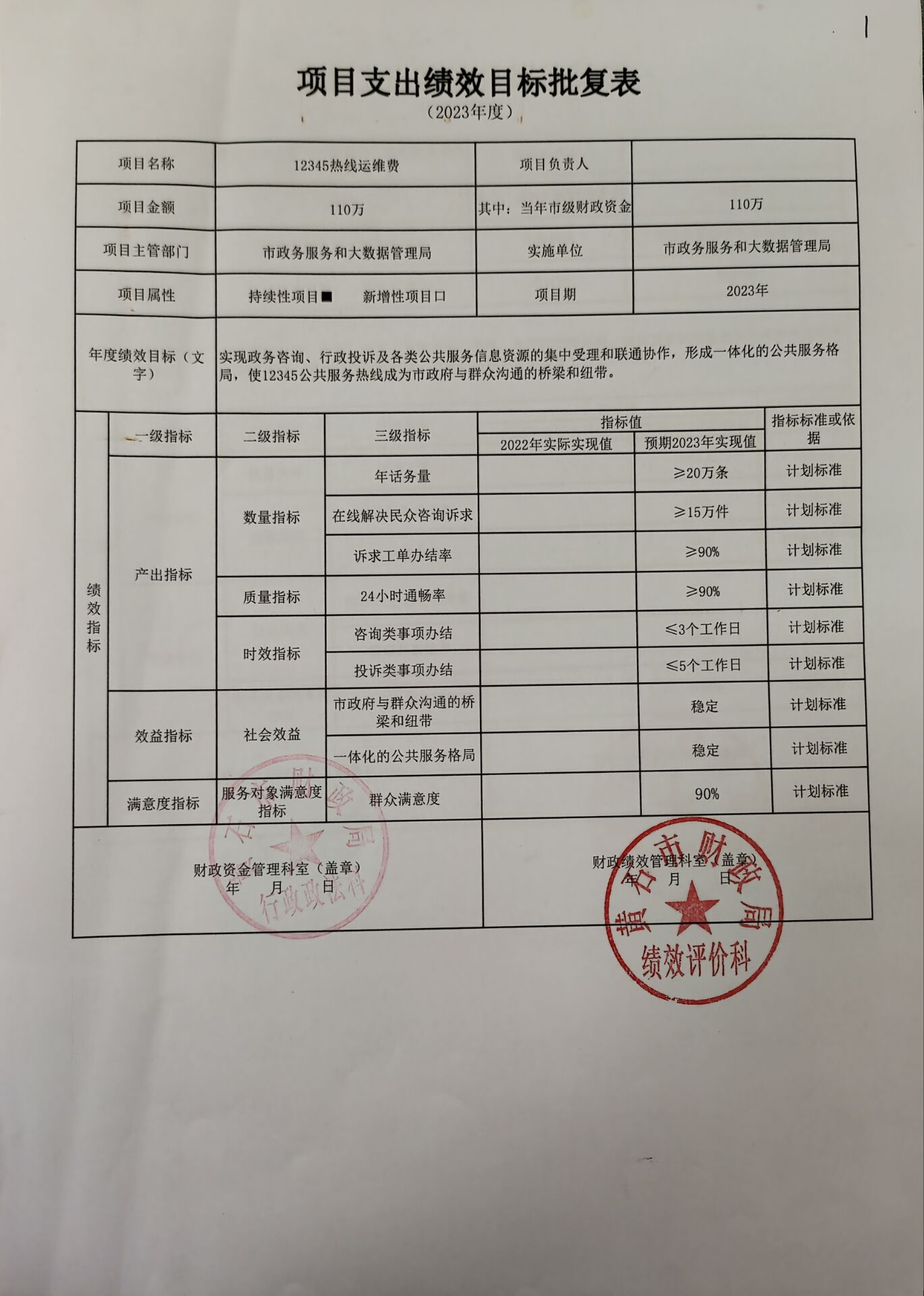 2023年部门项目预算绩效目标已经批复。我单位单项金额100万元以上的项目6项,分别为“公共资源平台、政府采购运维费”,项目金额104.00万元;“12345热线运维费”,项目金额110万元;“电子政务与政务公开相关工作经费”,项目金额233万元;“完美体育365软件下载_365bet国际娱乐网址_365审核要多久民之家“一窗通办”政府购买服务项目”,项目金额285万元;“市民之家营运资金”,项目金额864万元;“科技创新专项-智慧黄石”,项目金额1143万元。项目支出绩效目标批复表如下: