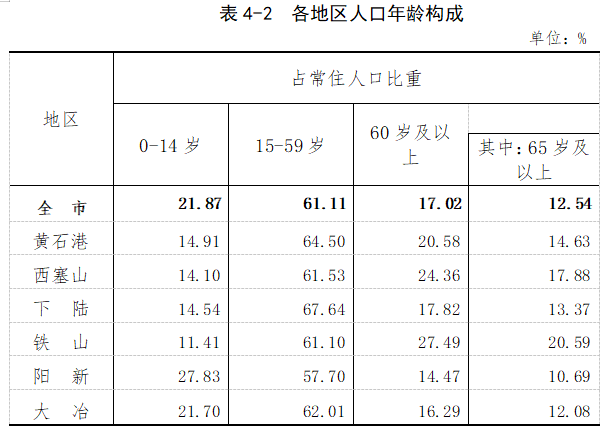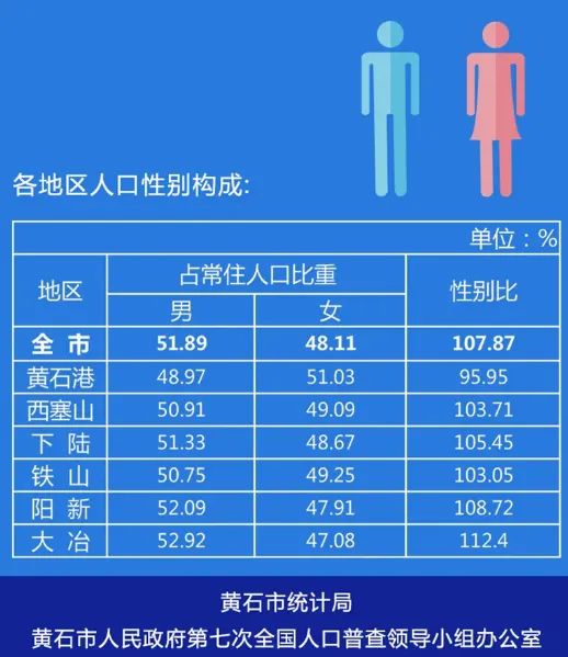 一、全市人口情况 1、常住人口 2020年11月1日零时,全市常住人口为2469079人。 2、人口增长 全市常住人口与2010年第六次全国人口普查的2429318人相比,增加39761人,增长1.64 %,年平均增长率为0.16%。 3、户别人口 全市共有家庭户[3] 822193 户,集体户23989户,家庭户人口为2335019人,集体户人口为134060人。平均每个家庭户的人口为2.84人,比2010年第六次全国人口普查减少0.54人。 二、地区人口情况 1、地区人口 6个县(市、区)中,常住人口超过50万人的县(市、区)有2个,在20万人至50万人之间的县(市、区)有2个,在10万人至20万人之间的县(市、区)有1个,少于10万人的县(市、区)有1个。 2、地区人口变化 与2010年第六次全国人口普查相比,6个县(市、区)中,有3个县(市、区)常住人口增加,依次为:阳新县、下陆区、黄石港区,分别增加74340人、38567人、17275人。 三、人口性别构成情况 1、全市人口性别构成 全市常住人口中,男性人口为1281287人,占51.89%;女性人口为1187792人,占48.11%。常住人口性别比(以女性为100,男性对女性的比例)为107.87,与2010年第六次全国人口普查107.62相比上升0.25。 2、地区人口性别构成 6个县(市、区)中,常住人口性别比在105以下的县(市、区)有3个,在105至110之间的县(市、区)有2个,在110以上的县(市、区)有1个。 四、人口年龄构成情况 1、全市人口年龄构成 全市常住人口中,0-14岁人口为539990人,占21.87%;15-59岁人口为1508972人,占61.11%;60岁及以上人口为420117人,占17.02%,其中65岁及以上人口为309695人,占12.54%。 与2010年第六次全国人口普查相比,0-14岁人口的比重提高4.48个百分点,15-59岁人口的比重降低9.34个百分点,60岁及以上人口的比重提高4.86个百分点,65岁及以上人口的比重提高4.74个百分点。 2、地区人口年龄构成 6个县(市、区)中,常住人口性别比在105以下的县(市、区)有3个,在105至110之间的县(市、区)有2个,在110以上的县(市、区)有1个。 五、人口受教育情况 1、受教育程度人口 全市常住人口中,拥有大学(指大专及以上)文化程度的人口为302251人;拥有高中(含中专)文化程度的人口为381962人;拥有初中文化程度的人口860397人;拥有小学文化程度的人口为625574人(以上各种受教育程度的人包括各类学校的毕业生、肄业生和在校生)。 与2010年第六次全国人口普查相比,每10万人中拥有大学文化程度的由7796人上升为12241人;拥有高中文化程度的由16456人下降为15470人;拥有初中文化程度的由39012人下降为34847人;拥有小学文化程度的由23249人上升为25336人。 2、平均受教育年限 与2010年第六次全国人口普查相比,全市常住人口中,15岁及以上人口的平均受教育年限由9.13年提高至9.64年。 6个县(市、区)中,平均受教育年限在11年以上的县(市、区)有2个,在10年至11年之间的县(市、区)有2 个,在10年以下的有2个。 3、文盲人口 全市常住人口中,文盲人口(15岁及以上不识字的人)为84139人,与2010年第六次全国人口普查相比,文盲人口减少22401人,文盲率由4.39%下降为3.41%,下降0.98个百分点。 六、城乡人口和流动人口情况 一、城乡人口 全市常住人口中,居住在城镇的人口为1628537人,占65.96%;居住在乡村的人口为840542人,占34.04%。与2010年第六次全国人口普查相比,城镇人口增加248596人,乡村人口减少208831人,城镇人口比重提高9.16个百分点。 二、流动人口 全市常住人口中,人户分离人口为765140人,其中,市辖区内人户分离人口为121756人,流动人口为643384人。 流动人口中,跨省流动人口为61949人,省内流动人口为581435人。 与2010年第六次全国人口普查相比,人户分离人口增加388125人,增长102.95%;市辖区内人户分离人口增加51799人,增长74.04%;流动人口增加336326人,增长109.53%。
